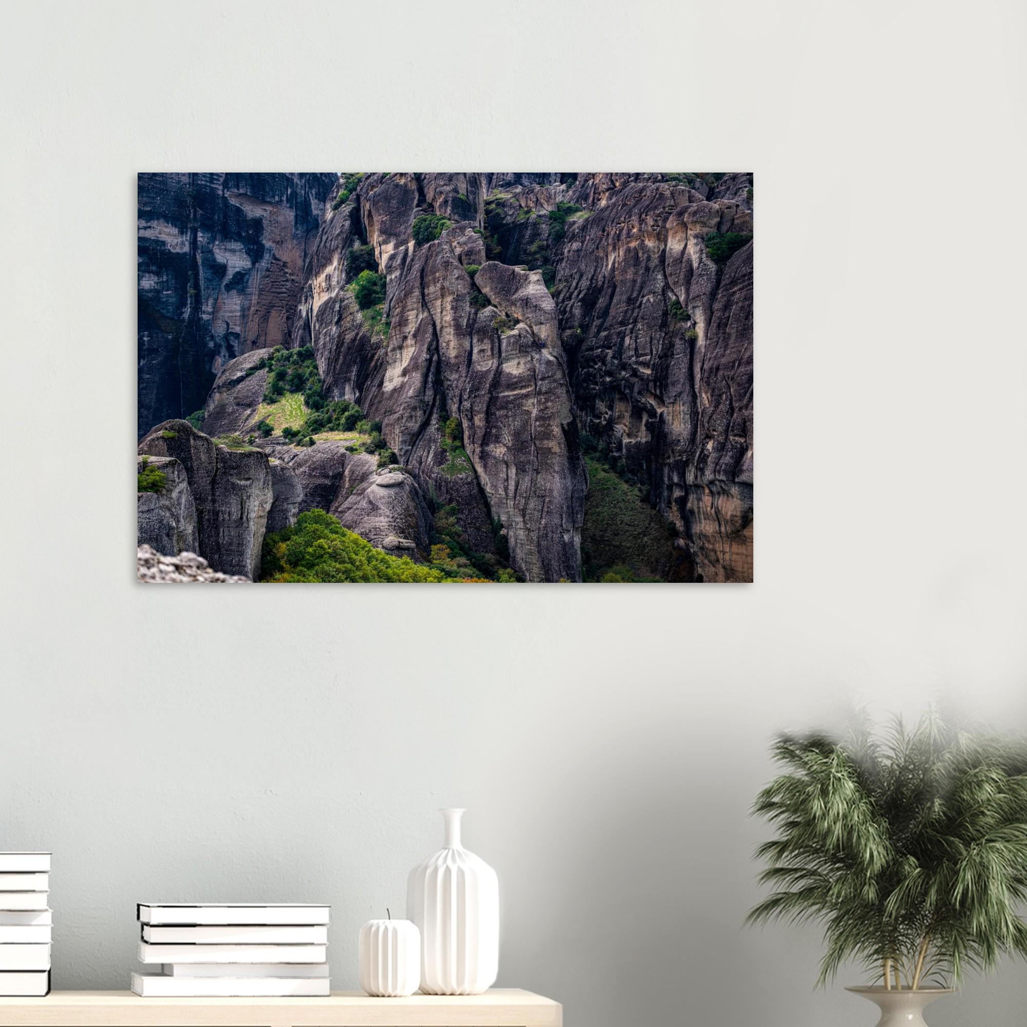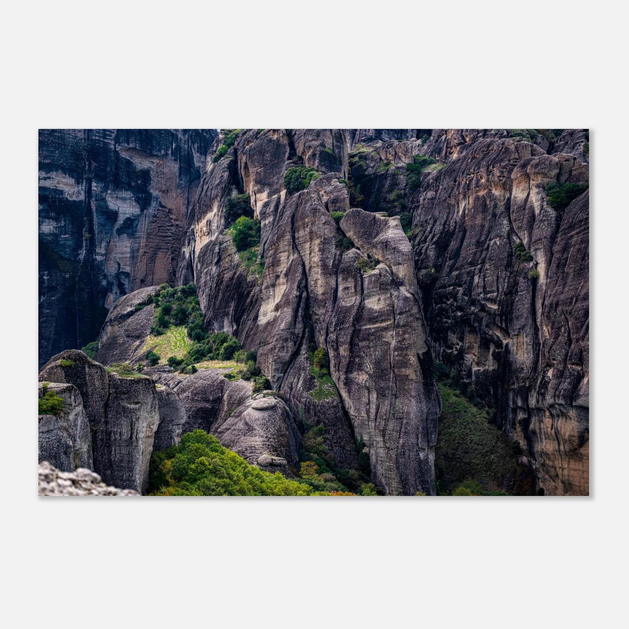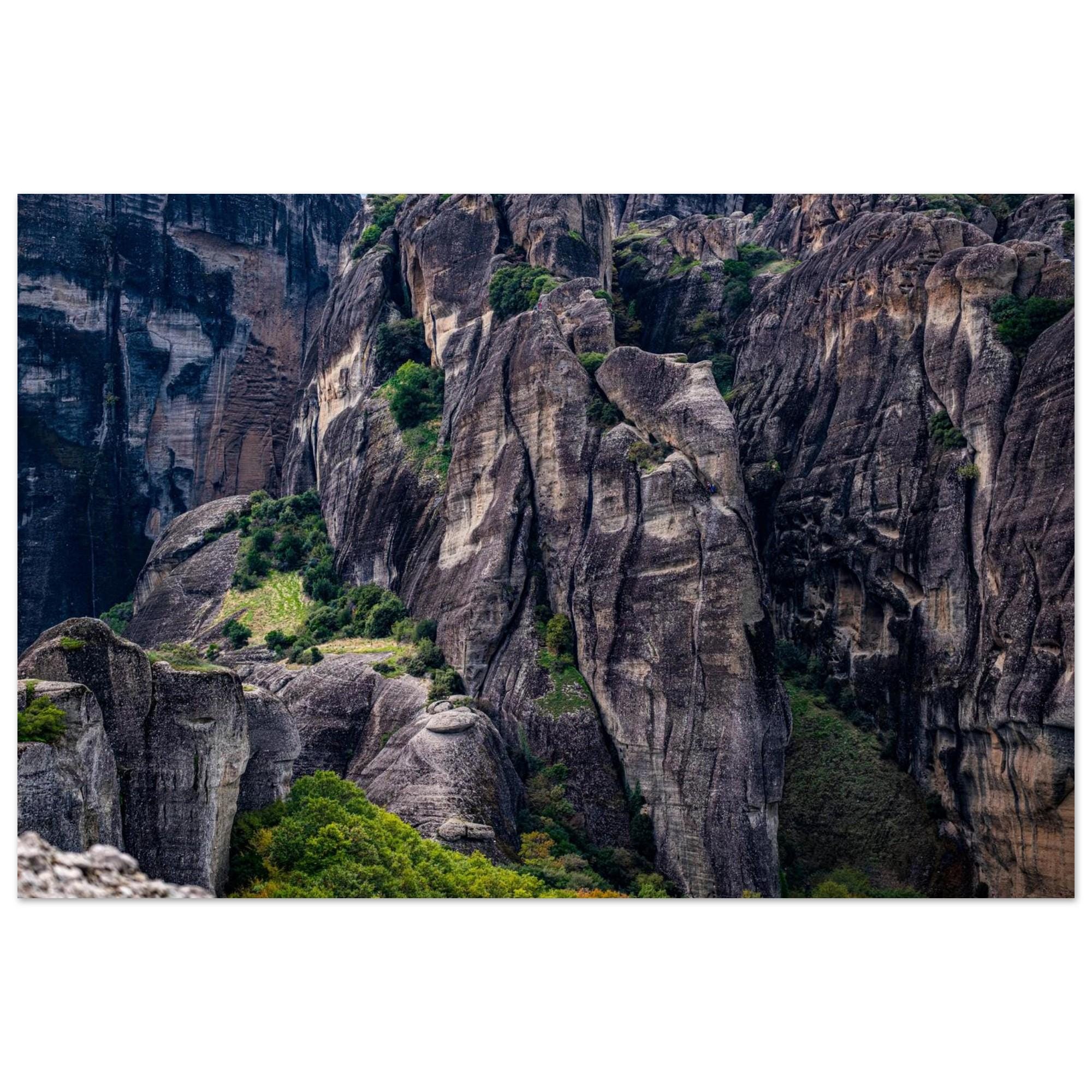 Monumental Rocks: This high-quality art print poster features a captivating color photograph of the rocky landscape in mythical Meteora. The timeless aesthetic of the landscape is a unique eye-catcher.