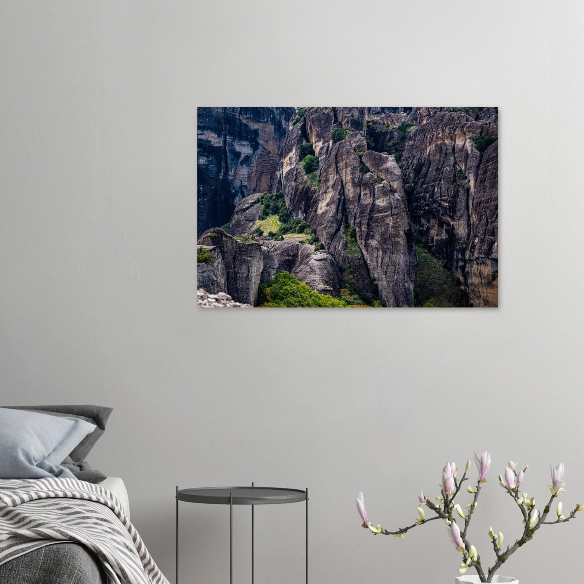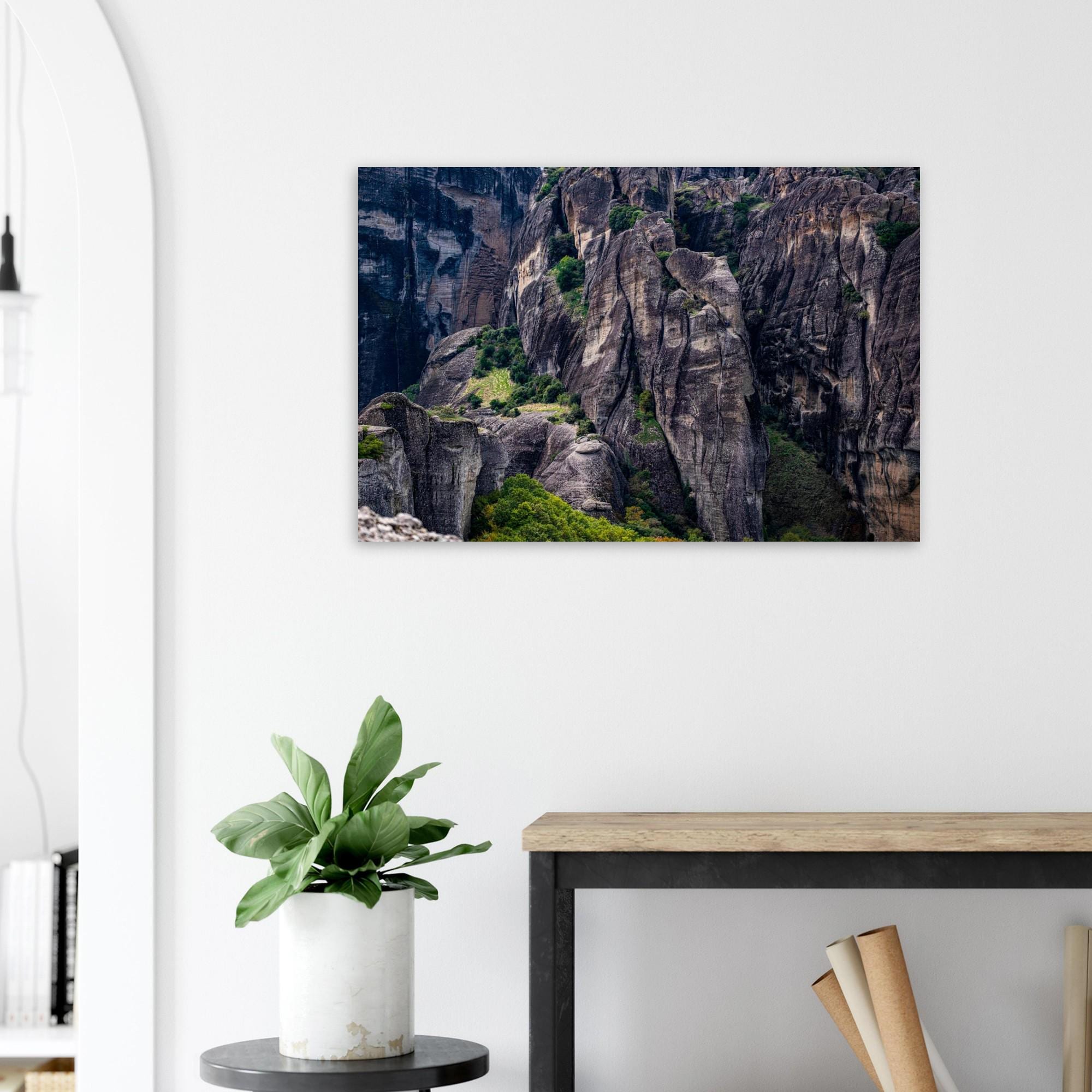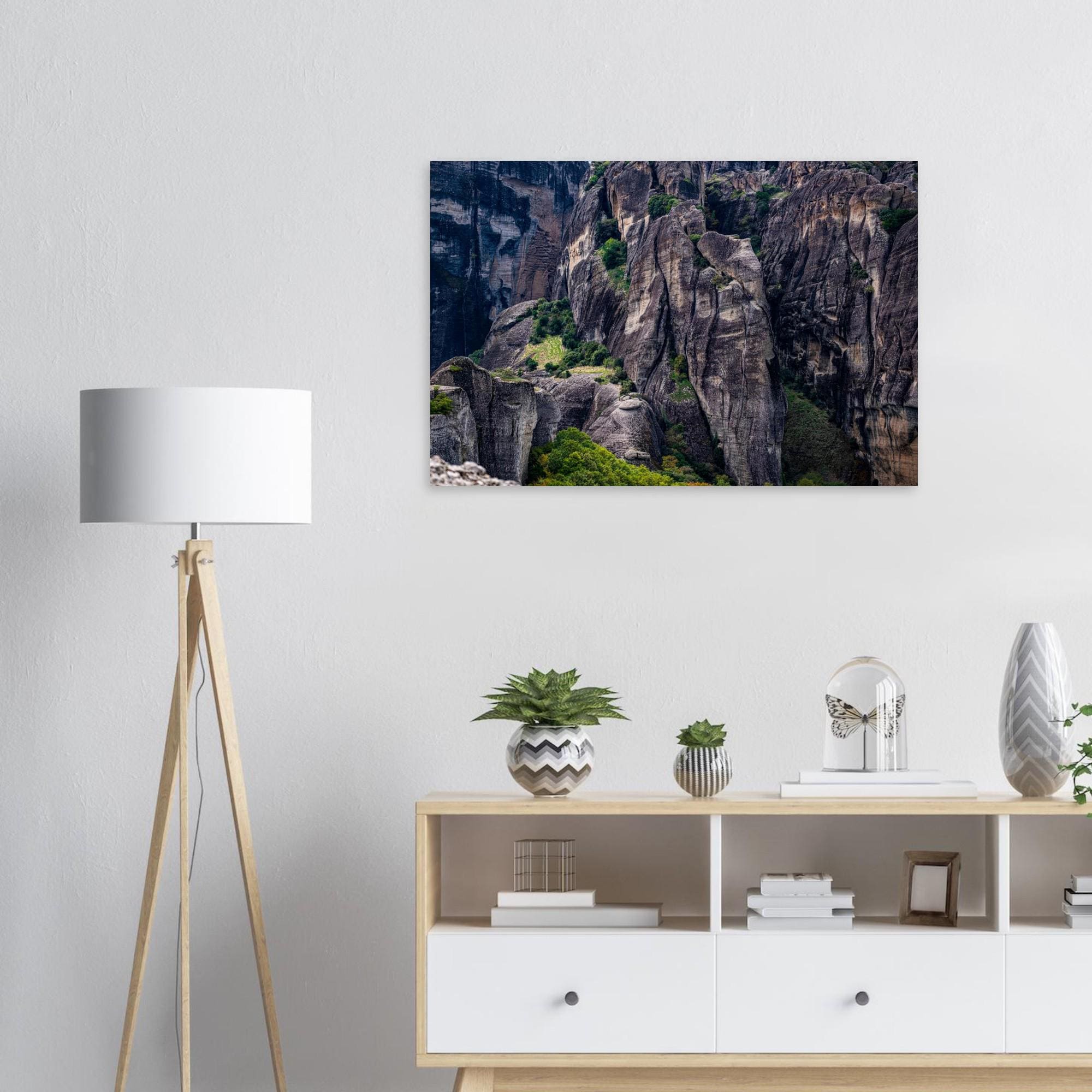 Monumental Rocks: This high-quality art print poster features a captivating color photograph of the rocky landscape in mythical Meteora. The timeless aesthetic of the landscape is a unique eye-catcher.